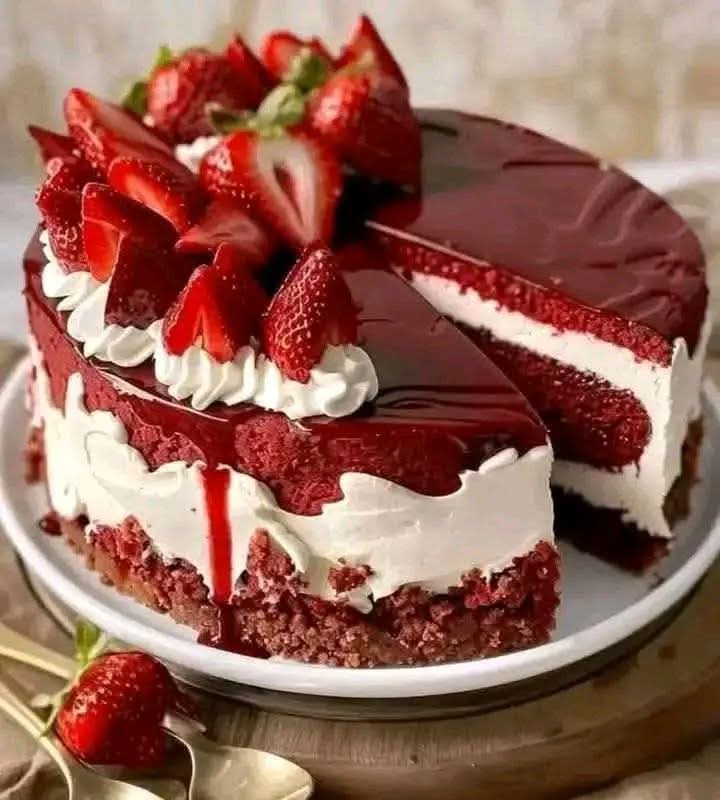 A dreamy blend of velvety cocoa layers, rich cream cheese frosting, and fresh strawberries — this cake is pure elegance and comfort in every bite! ✨