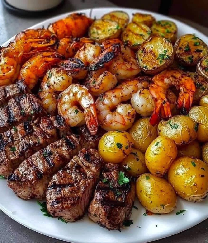 Grilled Steak & Shrimp with Herb-Roasted Baby Potatoes 🔥