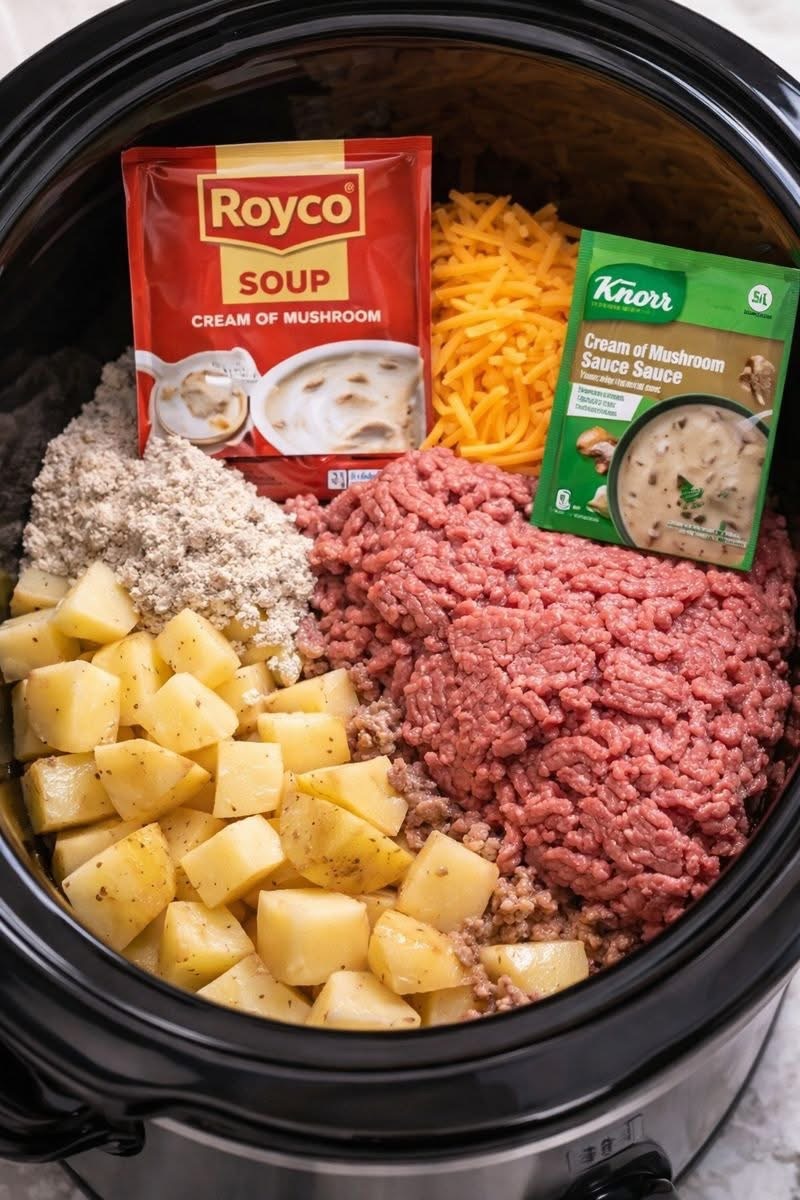 Cover and cook on LOW for 5–6 hours or on HIGH for 3–4 hours, until the potatoes are tender and the beef is fully cooked