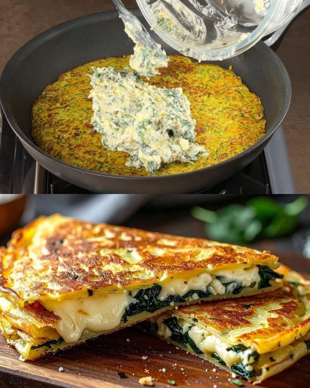 - Carefully flip using parchment paper or a plate, then cook the other side until golden and cheese is melted.