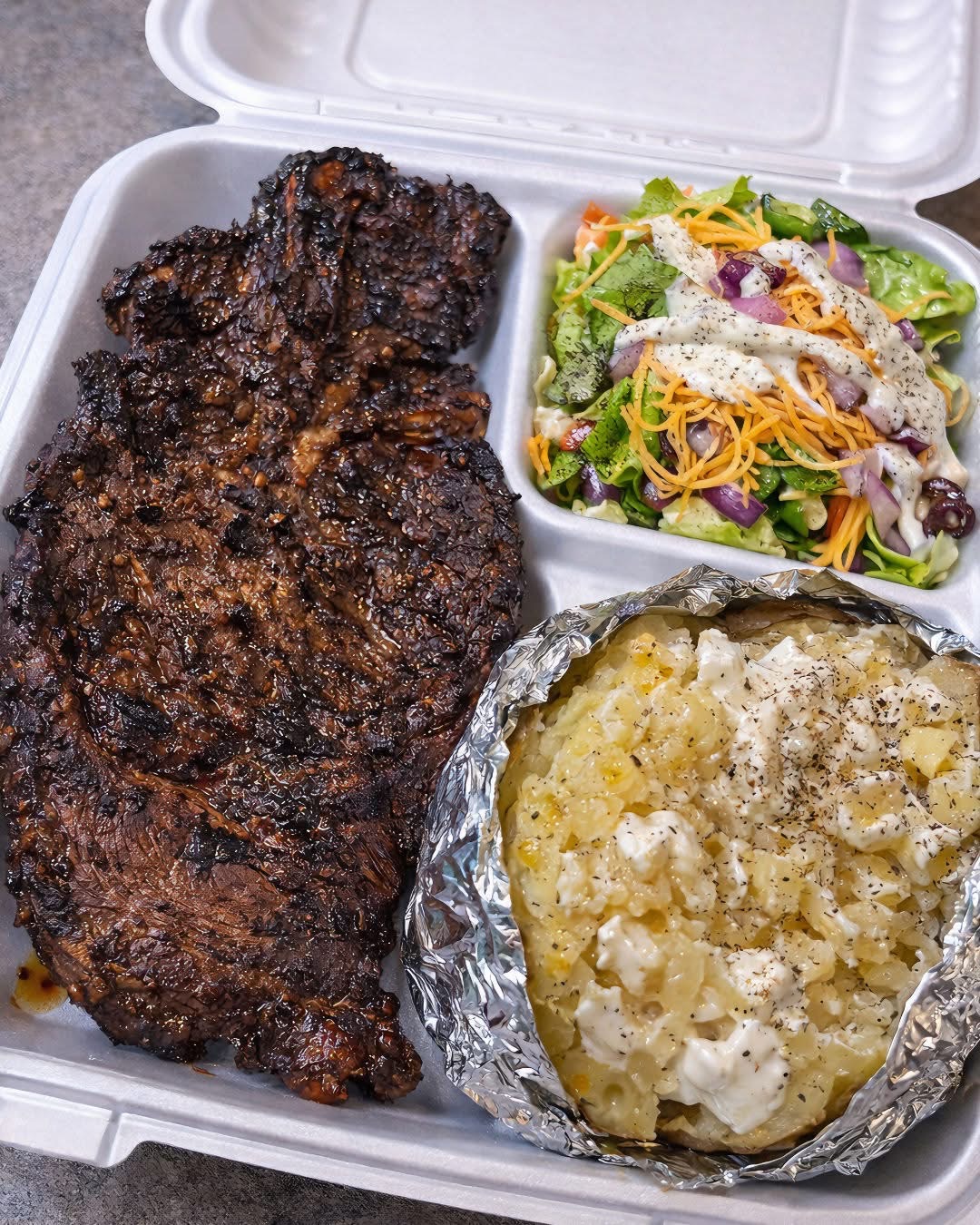 Ohhh yeah 😍 that tray is pure comfort food. Here’s a spot-on recipe to recreate it at home: Juicy Grilled Steak + Loaded Baked Potato + Creamy Side Salad.