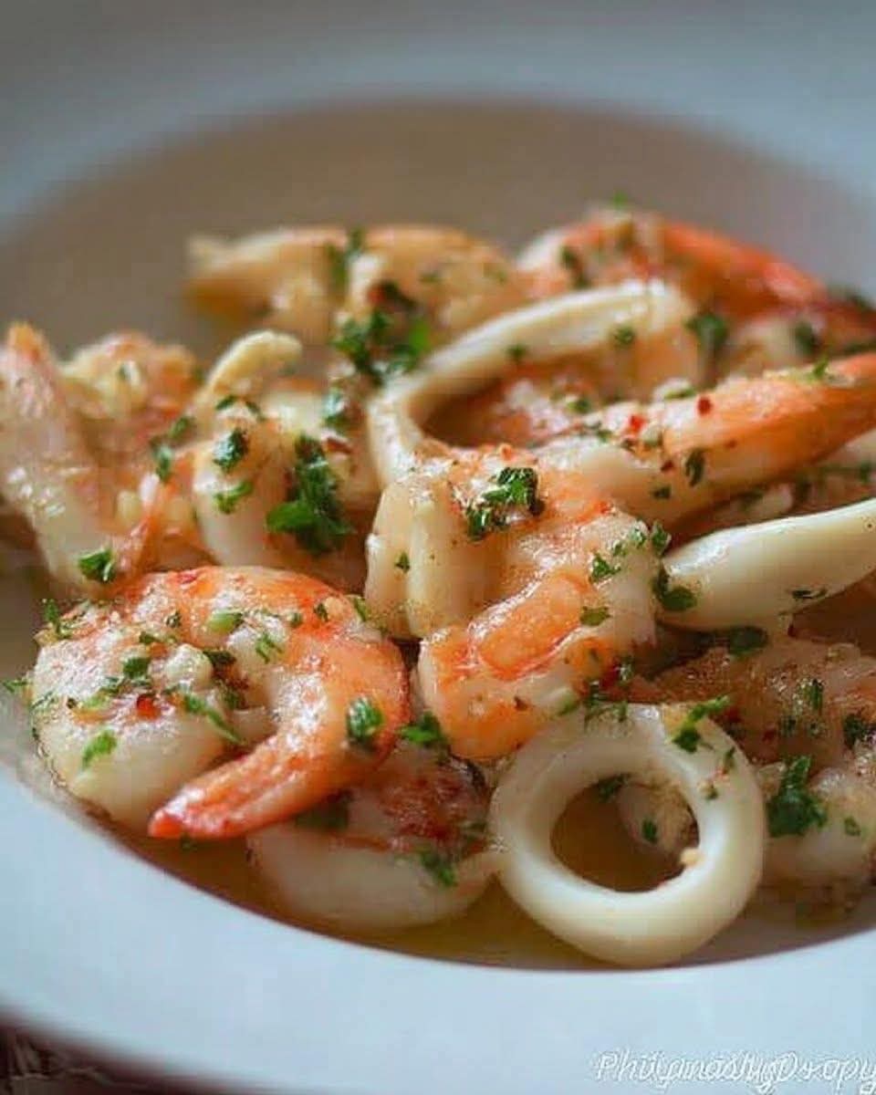 Begin by melting the butter in a pan over medium-low heat. Once the butter is sizzling and has melted completely, add the minced garlic. Cook the garlic gently, stirring occasionally, until it becomes a light golden brown. Next, incorporate the shrimp and calamari into the pan and stir-fry for approximately five minutes until the seafood is cooked through. Sprinkle in the chopped parsley and dried chili flakes, and add salt to taste. Transfer the mixture to a serving plate and enjoy your dish.