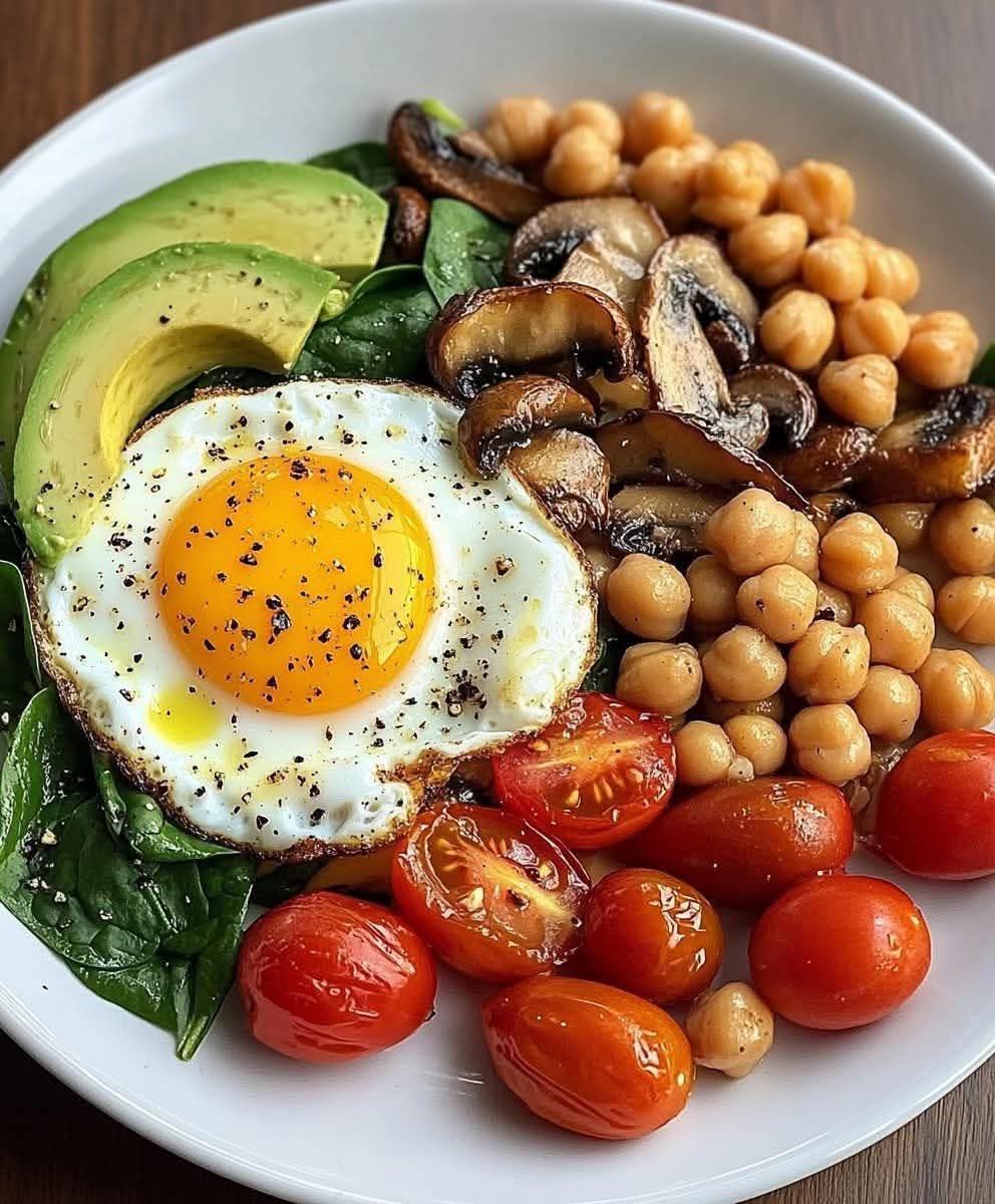 A vibrant, nutrient-packed breakfast plate featuring perfectly fried eggs, buttery avocado, juicy tomatoes, garlicky sautΓ©ed spinach, golden mushrooms, and lightly seasoned crispy chickpeas. Fresh, filling, and absolutely delicious!