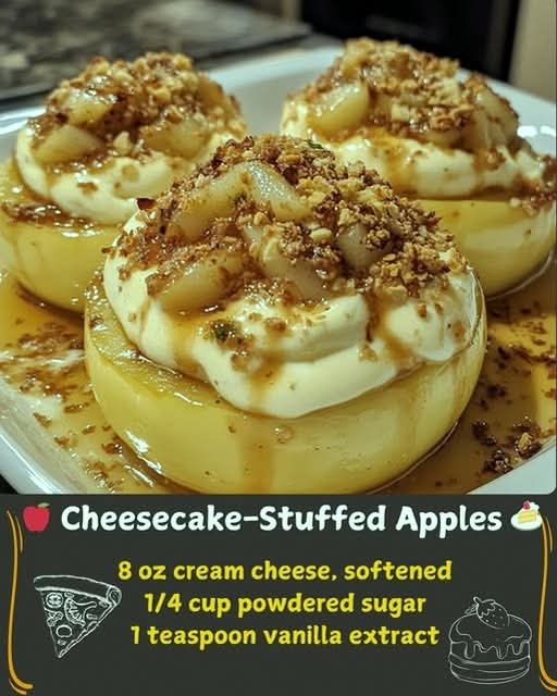 Stuff the Apples: Spoon the cheesecake mixture into each hollowed-out apple, filling them generously. Smooth the tops of the filling with a spoon or spatula.