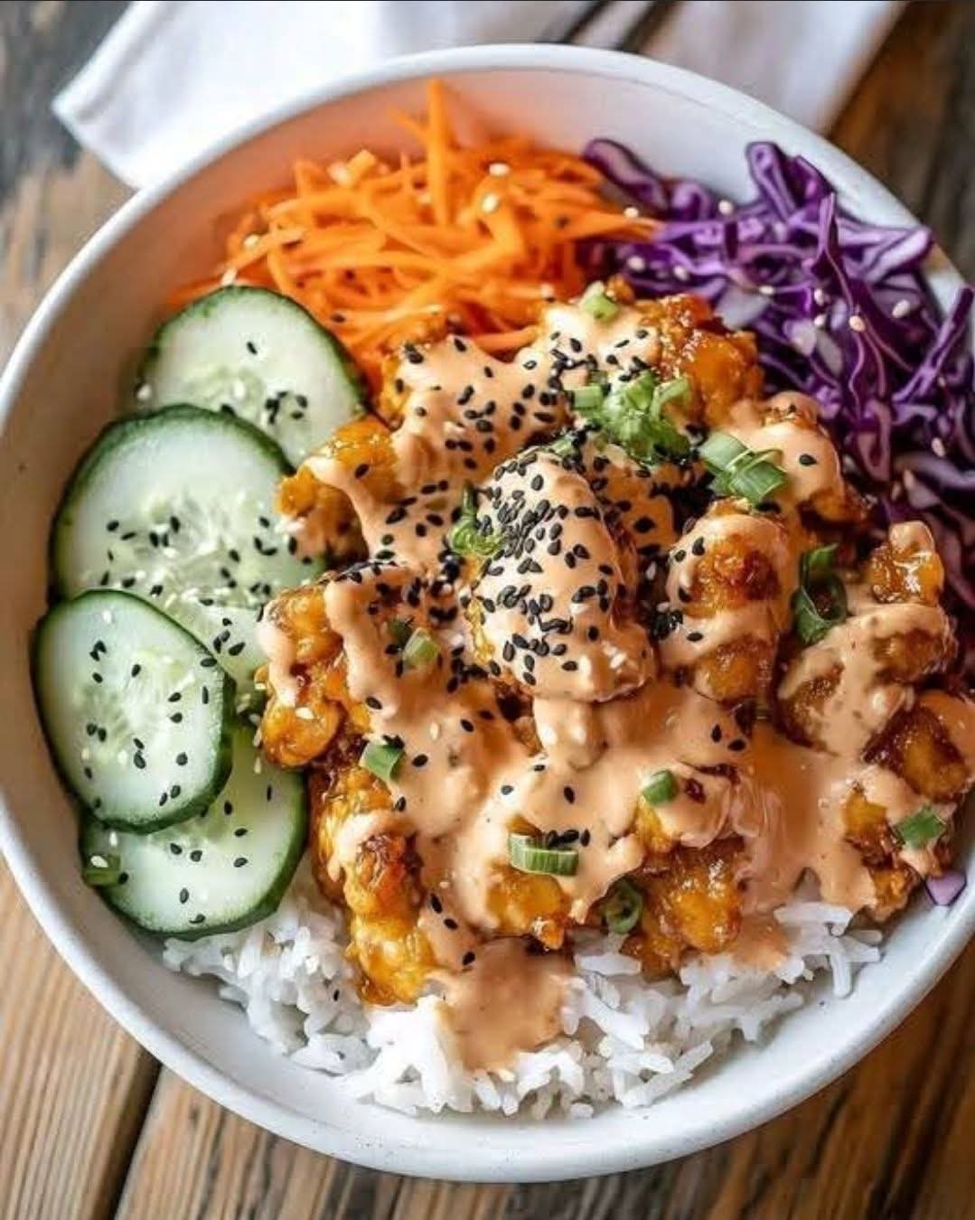 - Assemble the Bowl: Divide cooked rice into bowls. Top with cooked chicken, shredded cabbage, carrots, and cucumber.