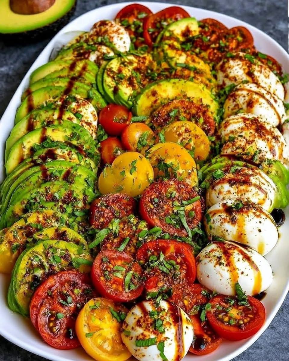 On a large serving plate, alternate avocado slices, mozzarella, and tomatoes in loose rows or a circular pattern.
