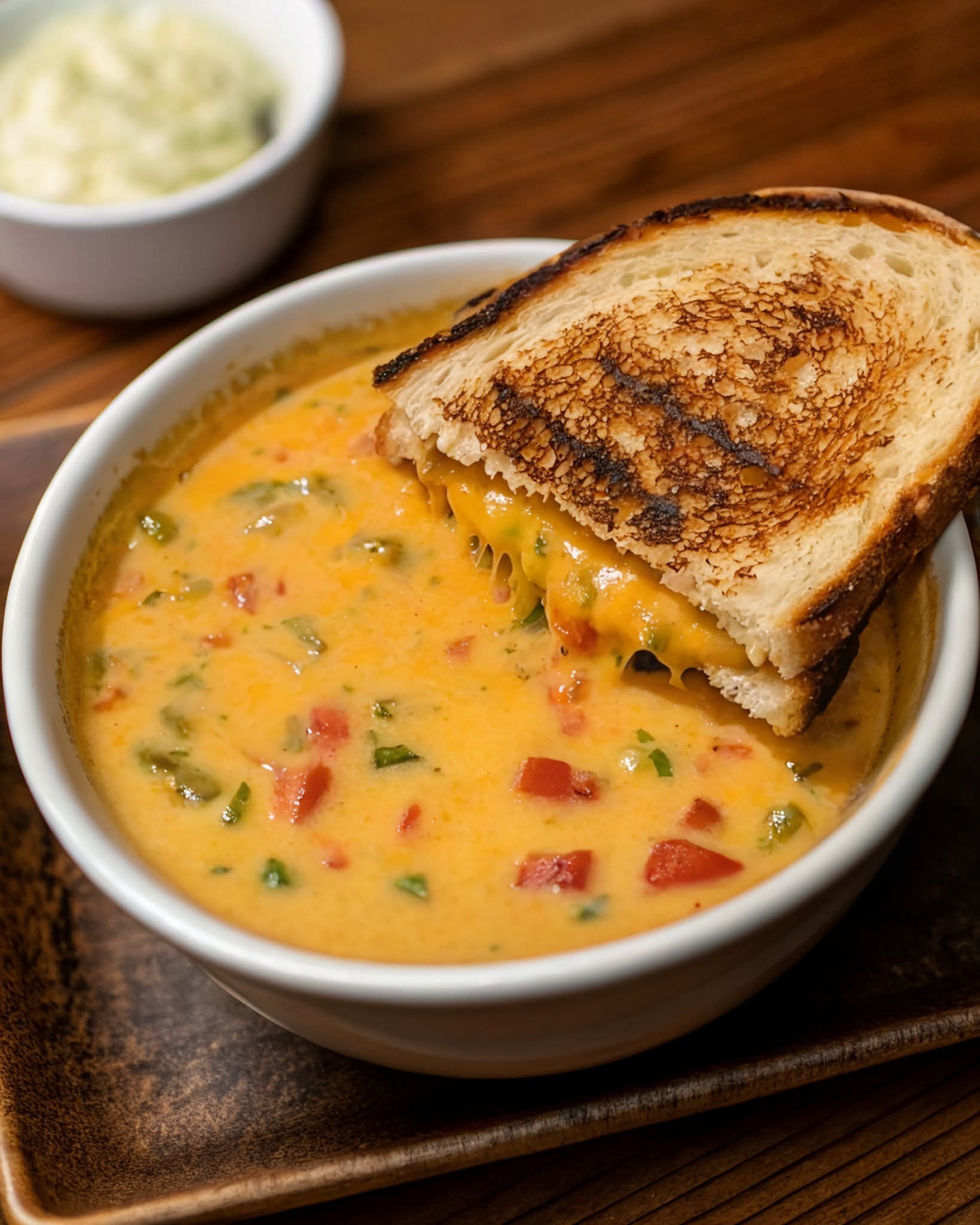 Ladle the soup into bowls and pair with grilled cheese dippers for dipping. Garnish with extra cheese, or sliced jalapeños if desired.
